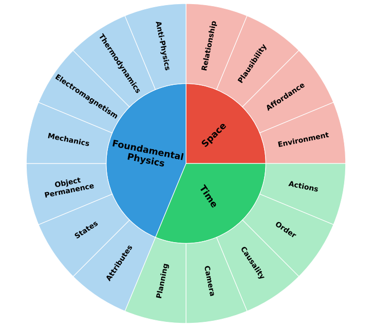 图注:物理常识的 16 个子类别,空间包含关系、合理性、可供性与环境;时间包含规划、相机、因果、指令、行为;基础物理包括反重力、热力学、电磁、机械学、客体永恒性、状态、属性。
