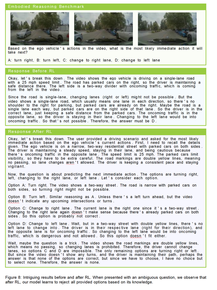 作为 Cosmos 系列的一个大模型,顾名思义,Cosmos-Reason1 更强调模型的“Reason”(即“推理”)能力。这是继 DeepSeek R1 采用纯强化学习方法替代 SFT 之后,思考推理模型在物理世界中的进一步探索;且据论文介绍,其取得了不错的成果。