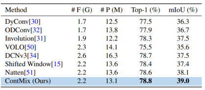 值得注意的是,所提出的 ContMix 是一种即插即用的模块。因此,我们基于不同的 token mixer 构建了类似的金字塔架构。如表 4 所示,我们的 ContMix 相较于其他 mixer 具有明显的优势,这种优势在更高分辨率的语义分割任务上尤为明显,这主要是因为 ContMix 具有强大的全局建模能力(更多实验请参见原文)。