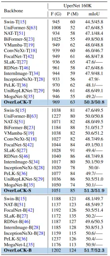 如表 3 所示,OverLoCK 在 ADE20K 上也进行了全面的评估,其性能在与一些强大的 Vision Backbone 的比较中脱颖而出,并且有着更优秀的 tradeoff。例如,OverLoCK-T 以 1.1% mIoU 的优势超越 MogaNet-S,较 UniRepLKNet-T 提升 1.7%。更值得一提的是,即便与强调全局建模能力的 VMamba-T 相比,OverLoCK-T 仍保持 2.3% mIoU 的显著优势。