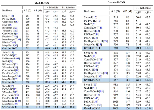 如表 2 所示,在 COCO 2017 数据集上,OverLoCK 同样展示出了更优的性能。例如,使用 Mask R-CNN (1× Schedule) 为基本框架时,OverLoCK-S 在 APb 指标上相较于 BiFormer-B 和 MogaNet-B 分别提升了 0.8% 和 1.5%。在使用 Cascade Mask R-CNN 时,OverLoCK-S 分别比 PeLK-S 和 UniRepLKNet-S 提升了 1.4% 和 0.6% APb。值得注意的是,尽管基于卷积网络的方法在图像分类任务中与 Transformer 类方法表现相当,但在检测任务上却存在明显性能差距。以 MogaNet-B 和 BiFormer-B 为例,两者在 ImageNet-1K 上都达到 84.3% 的 Top-1 准确率,但在检测任务中前者性能明显落后于后者。这一发现有力印证了我们之前的论点 — 卷积网络固定尺寸的卷积核导致有限感受野,当采用大分辨率输入时可能会性能下降。相比之下,我们提出的 OverLoCK 网络即使在大分辨率场景下也能有效捕捉长距离依赖关系,从而展现出卓越性能。