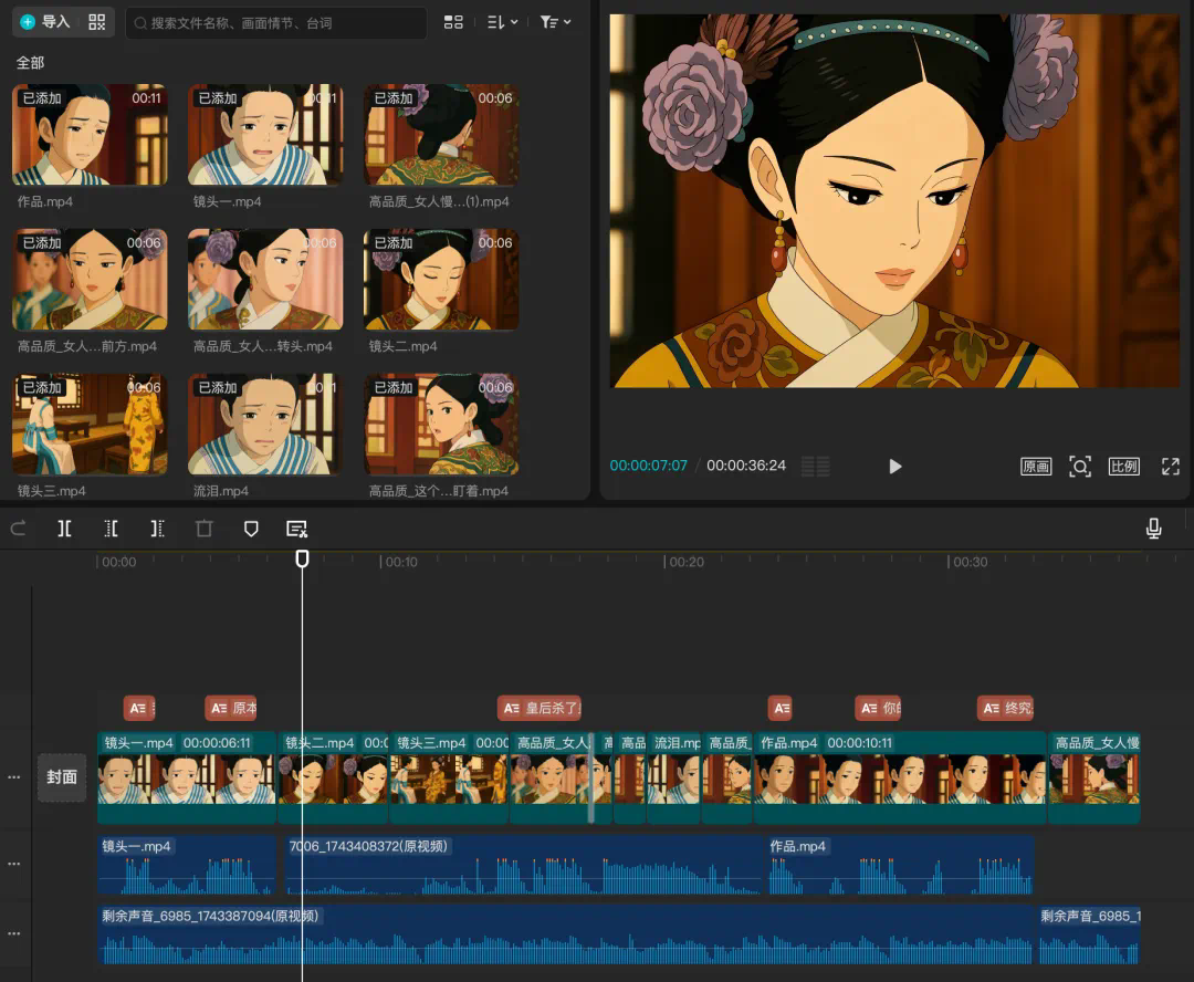 与上期操作一样,找到《甄嬛传》原版视频片段,截取其中几个关键镜头。