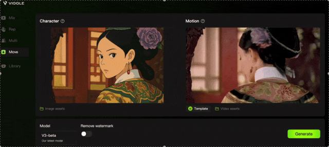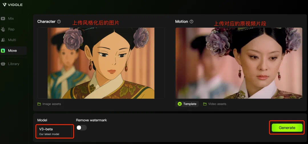 由于原视频片段中包含不少大幅度动作和细微的表情特写,所以一开始我们打算用 Viggle AI 的「Move」功能来生成。