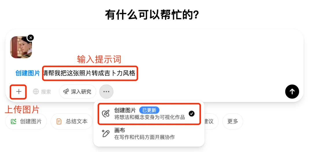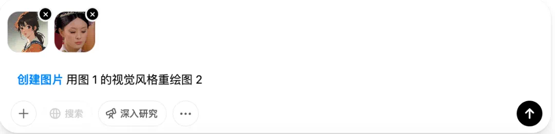 只需要上传一张吉卜力风格的图片,再上传想要重绘的图片,输入提示词「用图 1 的视觉风格重绘图 2」。