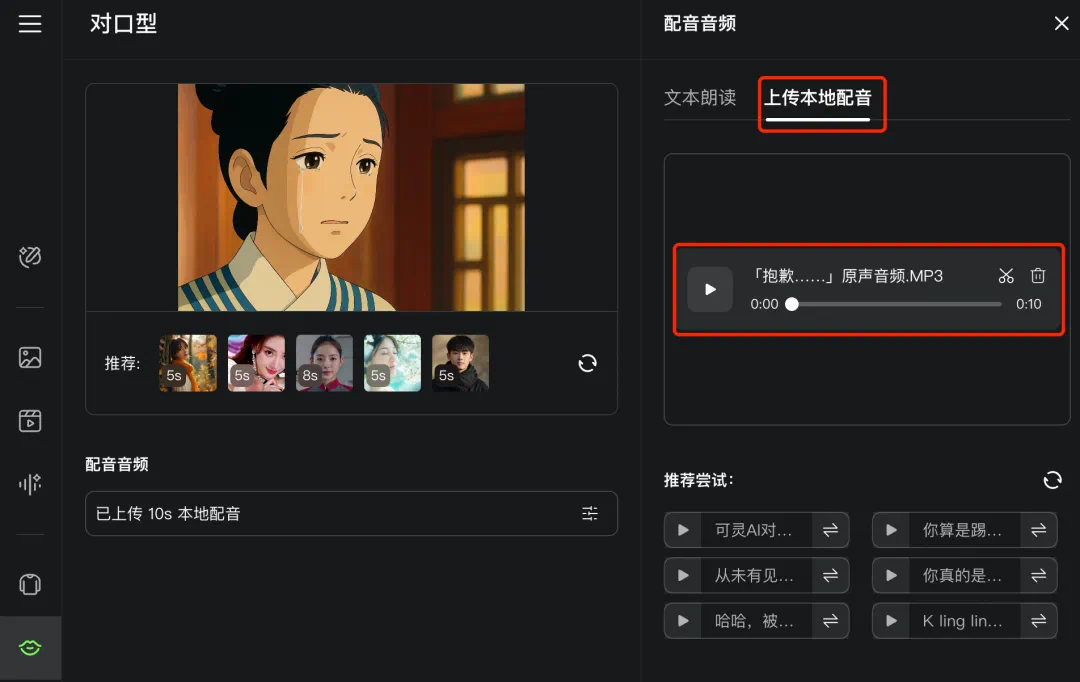 生成相应的视频后,我们点击「对口型」,然后上传对应的音频就 OK。