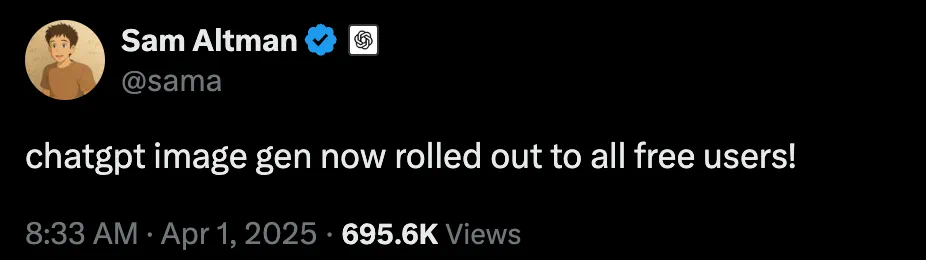 换句话说,即使是免费用户,也可以用 GPT-4o 生成最近爆火的吉卜力风格图片。