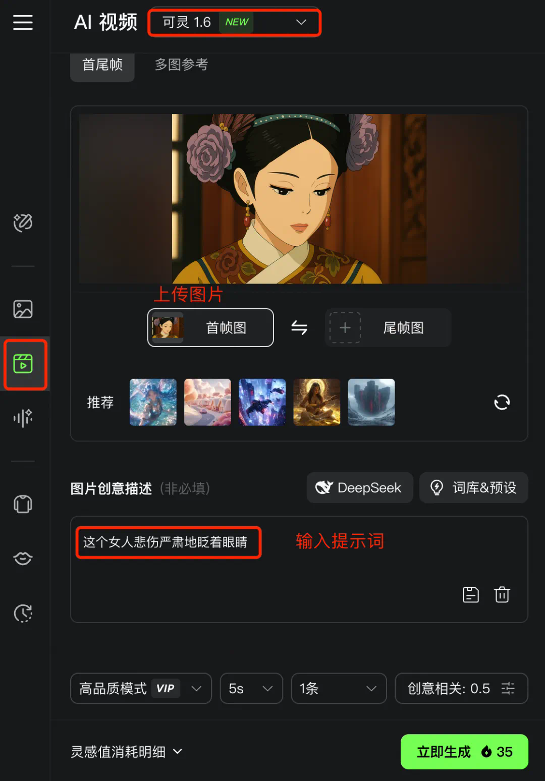 此外,我们也可以使用可灵 1.6 的「图生视频」功能,上传图片,再输入提示词。