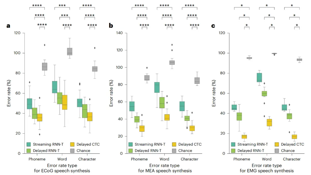 该系统转录的目标是患者大脑的言语运动皮层,采用 253 通道 ECoG 阵列,深度学习神经解码器经过 2.3 万次转语音训练,构建了延迟仅 80ms 的 RNN-T 架构,既可以合成语音也可以进行实时转录,音色模仿自患者受伤之前的录音。