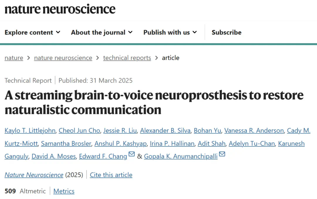 无法说话的人,现在可以通过大脑扫描的方式实时地用自己的声音说话了。整个过程没有延迟,也不需要打字,不用发出任何声音。