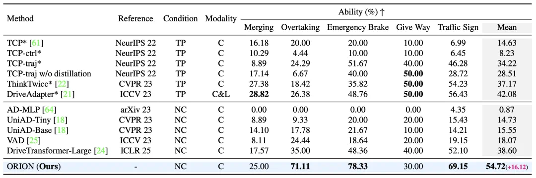 此外,如表 2 所示,ORION 还在 Bench2Drive 的多能力评估中表现优异,特别是在超车(71.11%)、紧急刹车(78.33%)和交通标志识别(69.15%)等场景中,ORION 的表现远超其他方法。这得益于 ORION 通过 VLM 对驾驶场景的理解,能够更好地捕捉驾驶场景之间的因果关系。