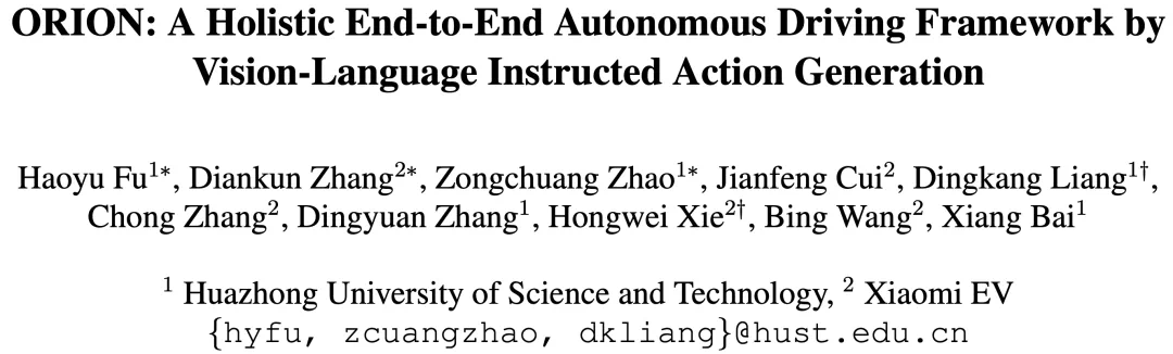 论文标题:ORION: A Holistic End-to-End Autonomous Driving Framework by Vision-Language Instructed Action Generation