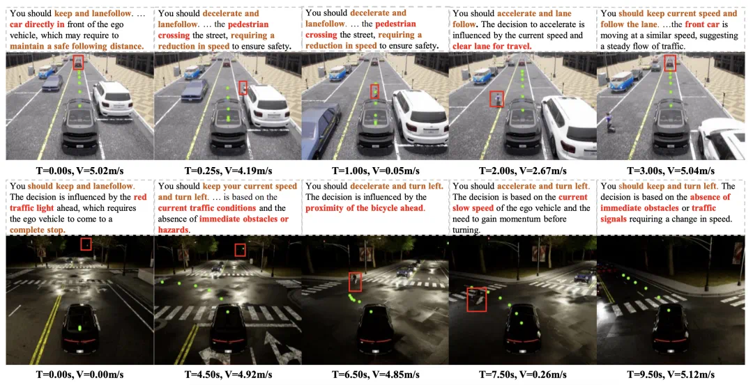 下图展示了 ORION 在 Bench2Drive 的闭环评估场景中的可解释性结果。ORION 可以理解场景中正确的因果关系,并做出准确的驾驶决策,然后根据推理信息指导规划轨迹预测。