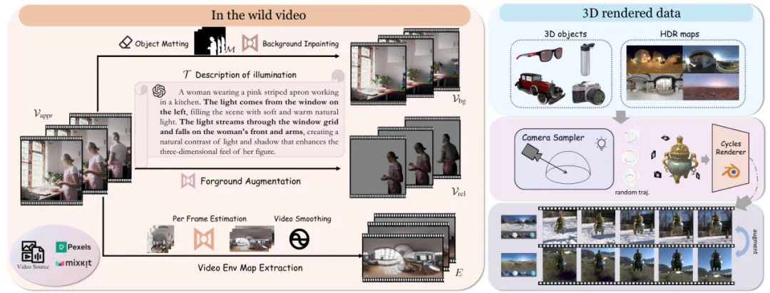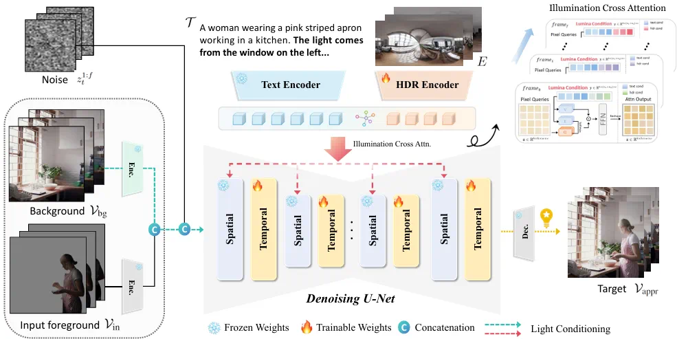 图 2. RelightVid 框架结构图,从背景合成、光照注入到最终编辑,全面支持高质量光影一致性视频重光照