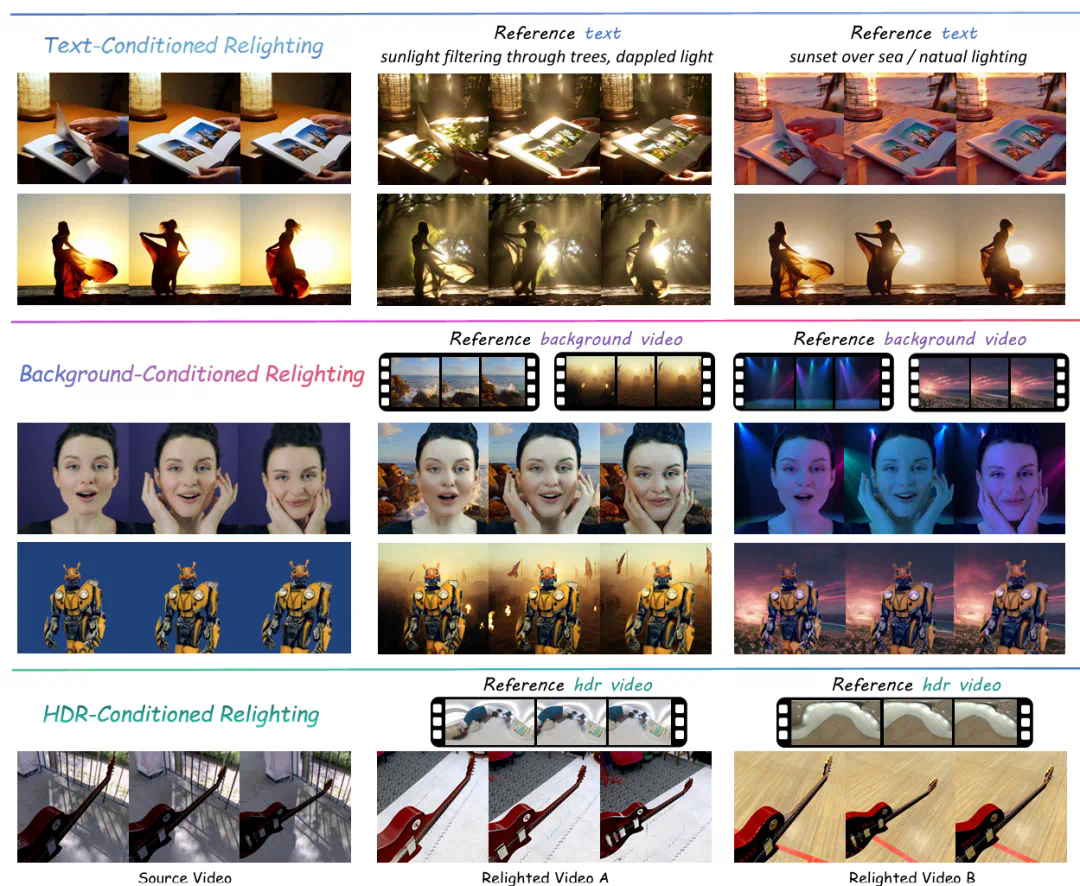 Reference-based Illumination Injection:支持通过静态图像、描述文字、甚至参考视频,实现多模态光照风格控制。