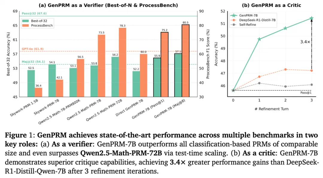 在 ProcessBench 等数学推理基准的测试中,GenPRM 展现出惊人实力:仅 1.5B 参数的模型通过测试时扩展超越 GPT-4o,而 7B 参数版本更是击败 72B 参数的 Qwen2.5-Math-PRM-72B,同时表现出强大的步骤级批评能力。