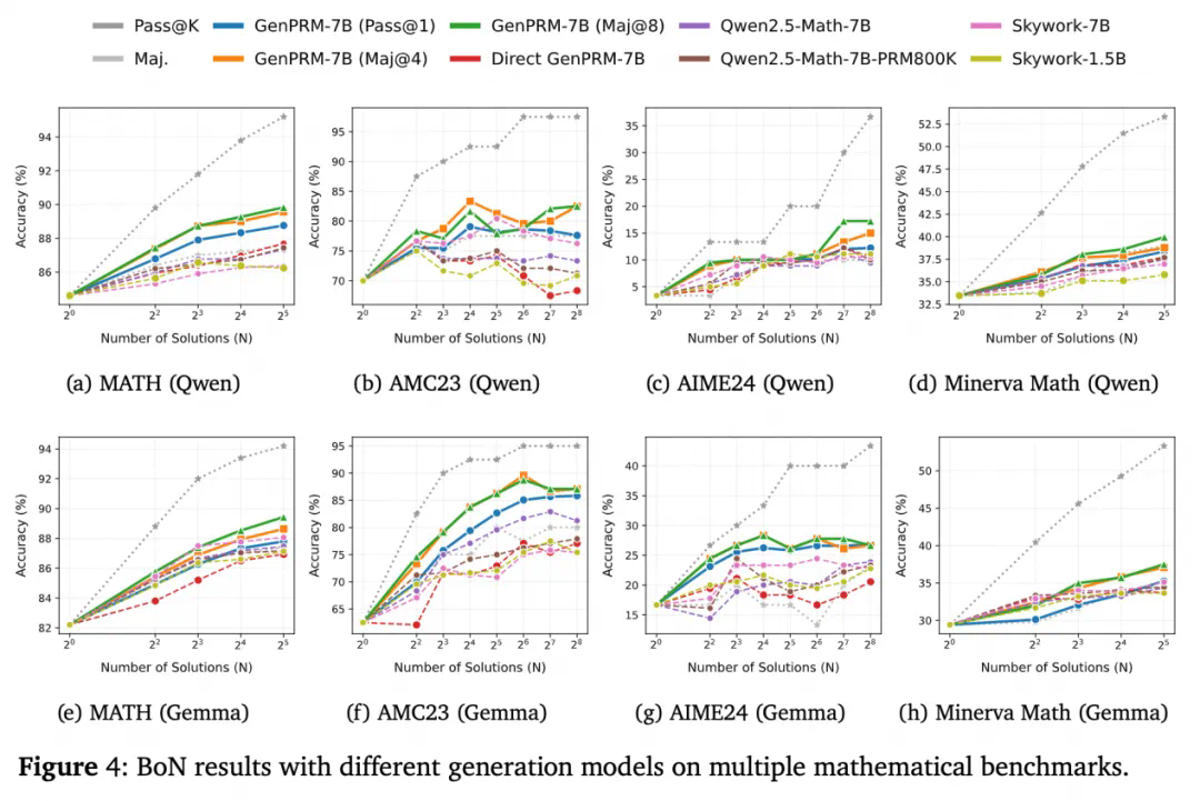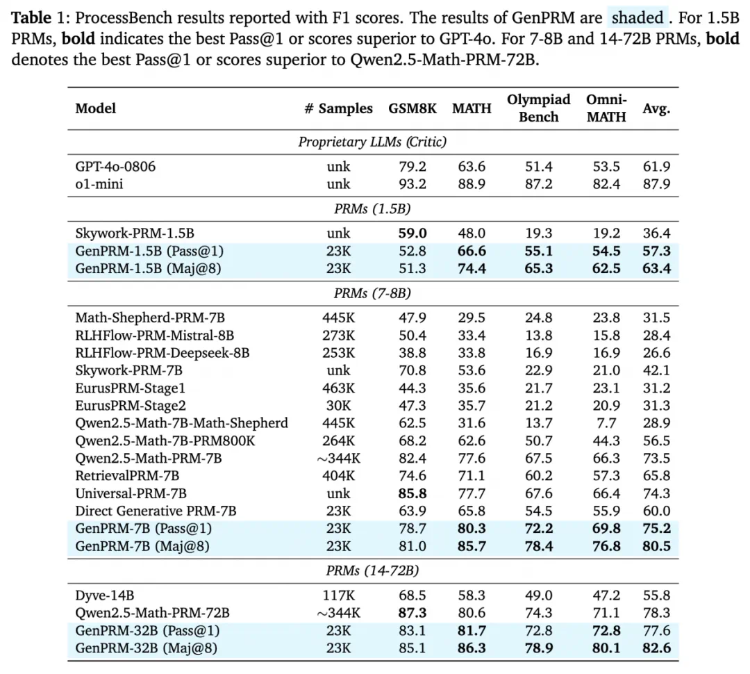 7B 版本的 GenPRM 以 80.5% 的 F1 分数一举超过 72B 参数的 Qwen2.5-Math-PRM-72B。