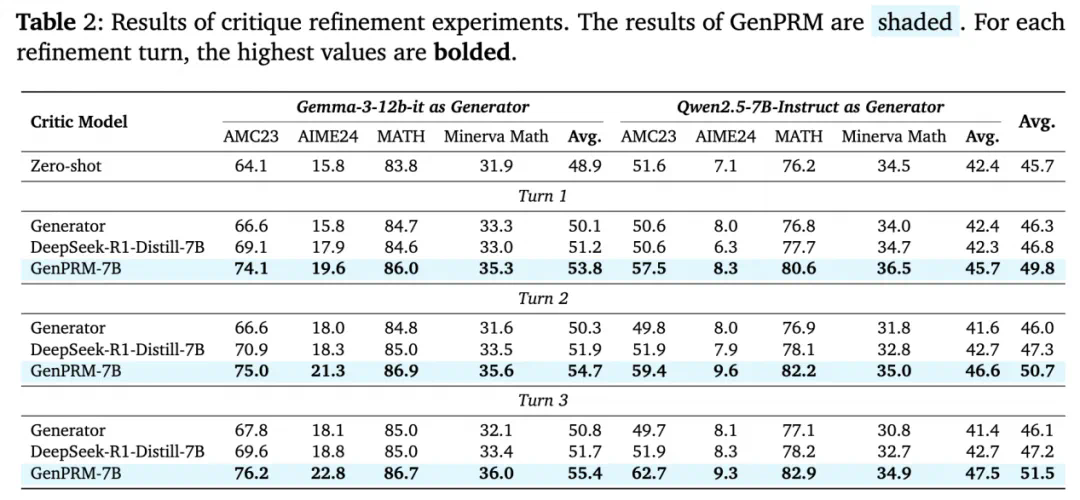 GenPRM 不仅能当 “裁判”,作为验证器(Verifier)筛选答案,还能当 “教练”,作为步骤级别的批评模型(Critic)指导策略模型迭代优化原始回答。实验表明,GenPRM 通过 3 轮反馈将策略模型的回答准确率从 45.7% 提升至 51.5%,性能提升达到基线方法的 3.4 倍。