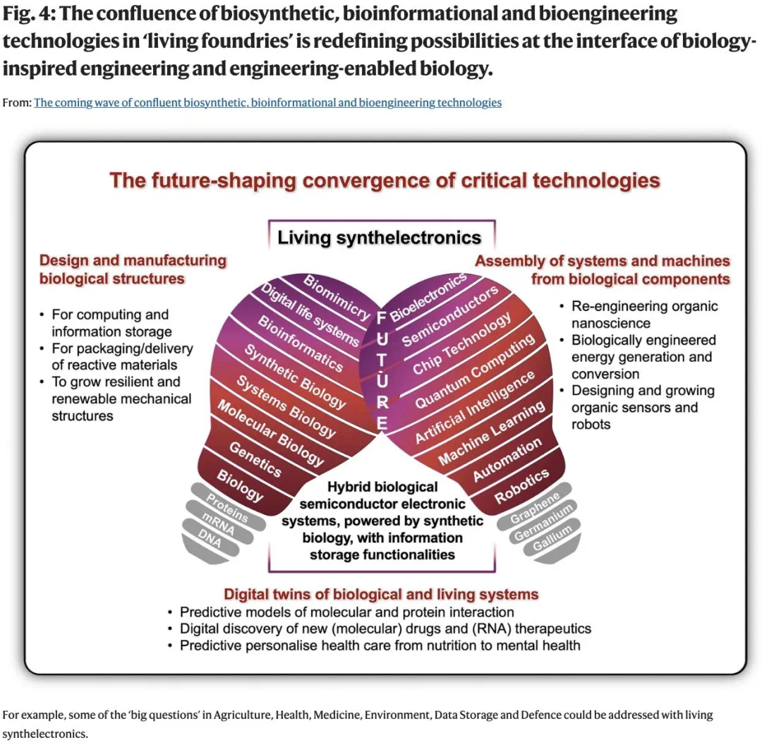 交叉融合的生物合成技术、生物信息工程与生物电子技术,其应用场景涵盖新药研发、合成燃料生产、太阳能电池制造、新型材料结构培育、生物计算系统制造等等。
