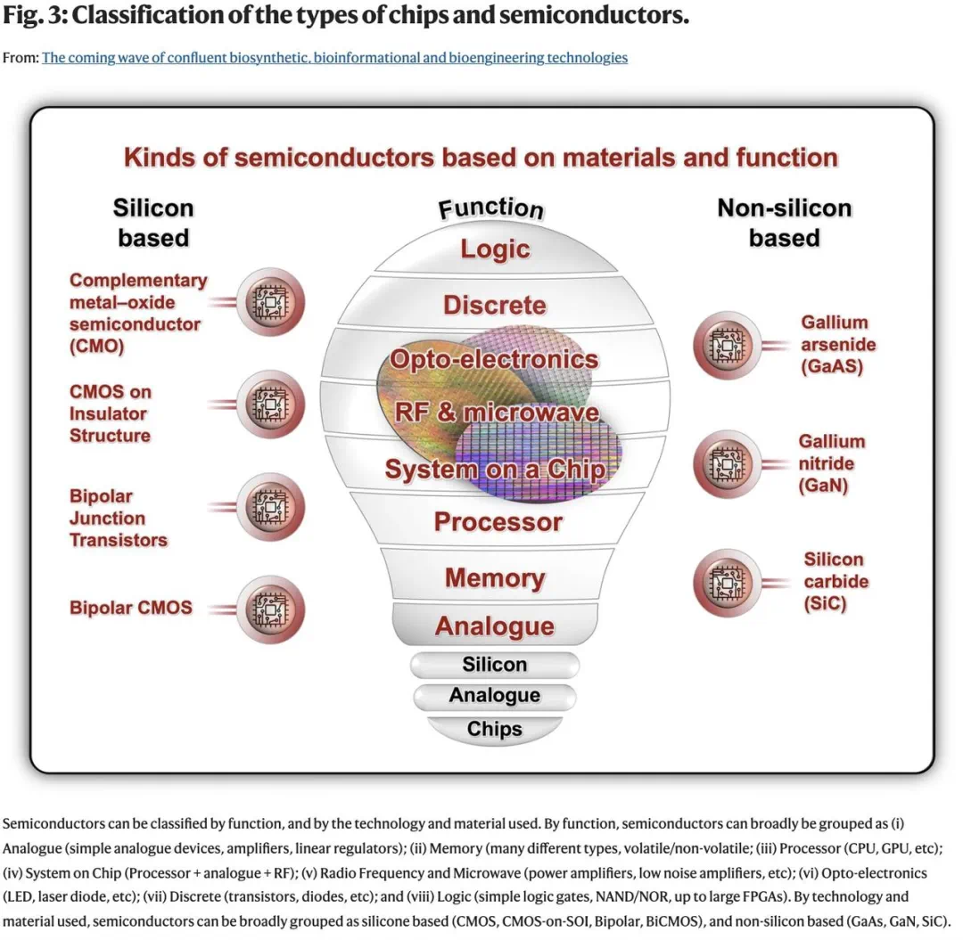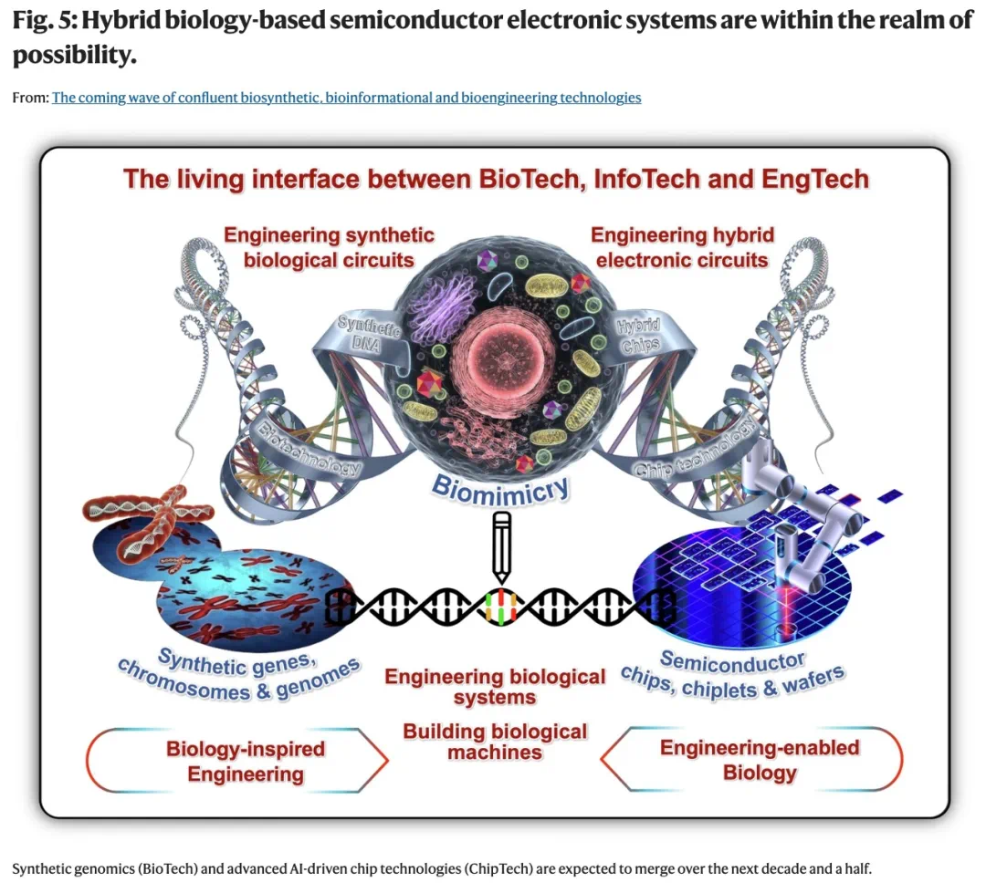 综述核心内容主要围绕 AI 驱动的半导体技术、合成生物学、生物智能等几个方向展开。