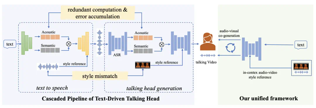 近年来,随着语言大模型的迅速发展,虚拟主播、虚拟助手等应用得到了广泛的推广与使用。然而,针对文本驱动的数字人生成研究仍然较少,现有方法主要采用级联流水线的方式,将文本转语音(Text-to-Speech, TTS)系统与音频驱动的数字人模型相结合。这种传统流水线一方面引入了系统复杂性和延迟开销,尤其是在实时互动场景下,各模块之间的延迟问题成为影响用户体验的重要因素;另一方面还从根本上存在音画输出不同步以及生成语音与视觉表情风格不一致的问题,无法完美复制真人的说话风格。