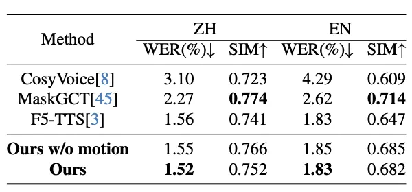 表 1 展示了我们的方法在音频测试集 Seed 上的测试结果,与 TTS 基线模型相比,我们的生成结果显示出更低的错词率(WER),这表明生成的音频与文本之间具有更高的一致性。此外,我们的方法在声音相似度(SIM)指标中排名第二,进一步证实了其在零样本条件下保持声音特征的能力。值得注意的是,通过对比包含和不包含运动分支(Ours w/o motion)的模型表现,可以看出完整模型实现了更低的 WER,这证明了结合视觉监督能有效提升生成音频的感知质量。我们将这种改进归因于多任务学习的有效性,因为在音频生成和面部动作之间存在着高度的相关性,两者结合可以相互促进,从而提高整体输出的质量。