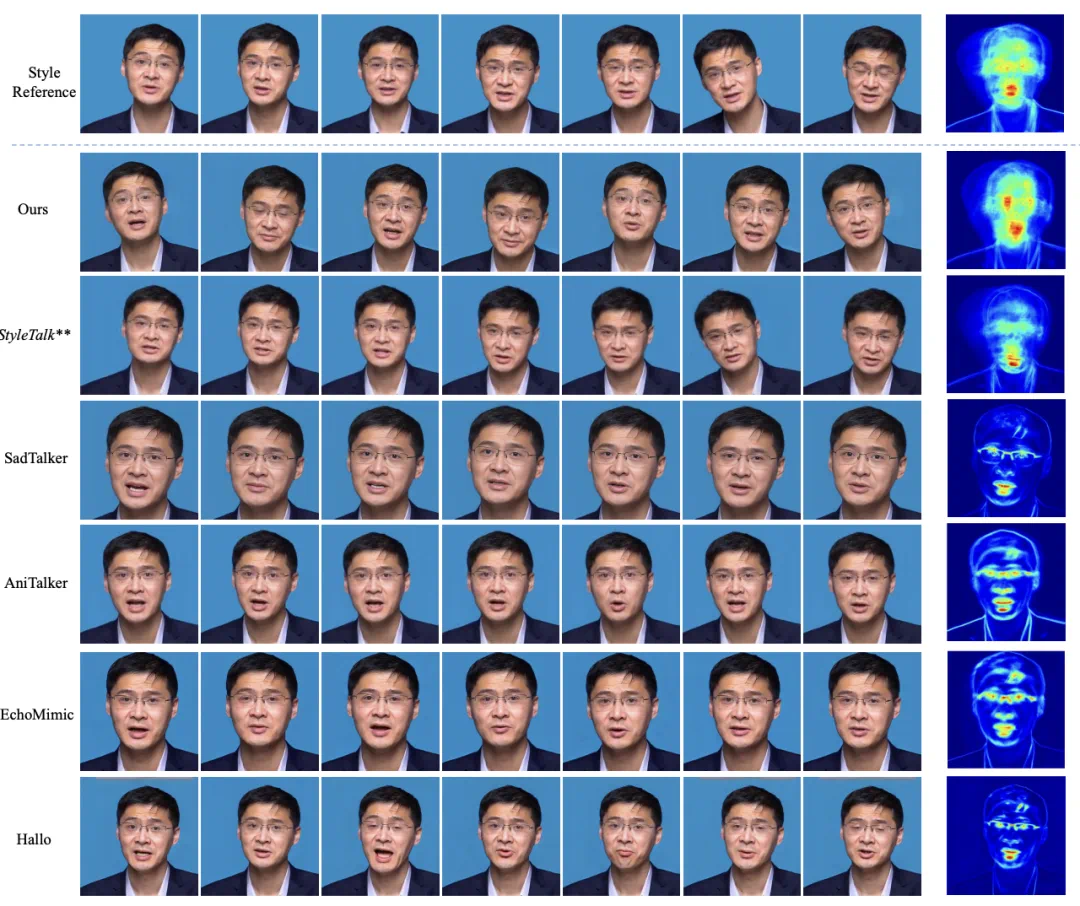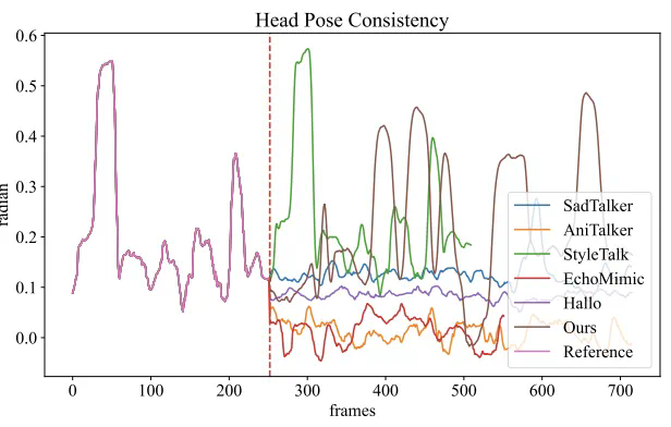 为了更直观地展示 OmniTalker 建模面部运动风格方面的卓越能力,我们对比了不同方法生成结果中的头部运动累积热图。如图 4 所示,通过将生成的视频与参考视频进行比较,可以清晰地看到,我们的方法生成的热图与真实数据的热图更为接近。图 3 则从时间维度进一步验证了这一点,我们选择头部偏航角(Yaw)作为跟踪指标来观察头部姿态的变化。左侧的红线代表参考序列,右侧展示了由各种方法生成的序列。结果显示,我们方法生成的序列无论是在幅度还是运动频率方面,都与参考序列保持了高度的一致性,同时保留了必要的自然差异,这表明我们的方法能够有效地继承头部姿态的风格特征。相比之下,其他方法生成的头部运动往往不够明显,缺乏动态变化。特别是 StyleTalk 方法直接复制参考姿势序列,虽然保证了与参考姿势的高度一致,但未能考虑语音内容与姿态之间的语义关联,导致生成结果缺乏灵活性和自然感。