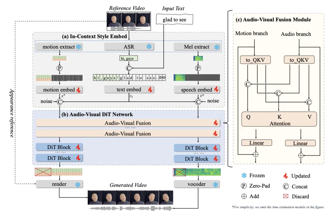 在训练阶段,音频和视觉特征会随机掩码序列的一部分,利用上下文学习来达成风格复刻的需求;而在推理阶段,则依据参考音频的节奏及输入文本的长度对音视频特征进行零填充,确保处理的一致性。