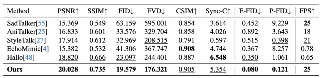 在视觉质量评估方面,除了传统的峰值信噪比(PSNR)、结构相似性(SSIM)、Frechet Inception Distance(FID)、Frechet Video Distance(FVD)、ID 相似度(CSIM)以及口型同步(Sync-C)等指标外,我们还引入了两个新的评估标准 ——E-FID(表情 FID)和 P-FID(姿势 FID),以分别衡量生成的面部表情和头部姿势的真实感。具体而言,E-FID 结合了 51 维面部混合形状系数和 4 维眼动参数进行计算,而 P-FID 则通过 6 维旋转 – 平移参数来量化头部姿势的一致性和真实性。