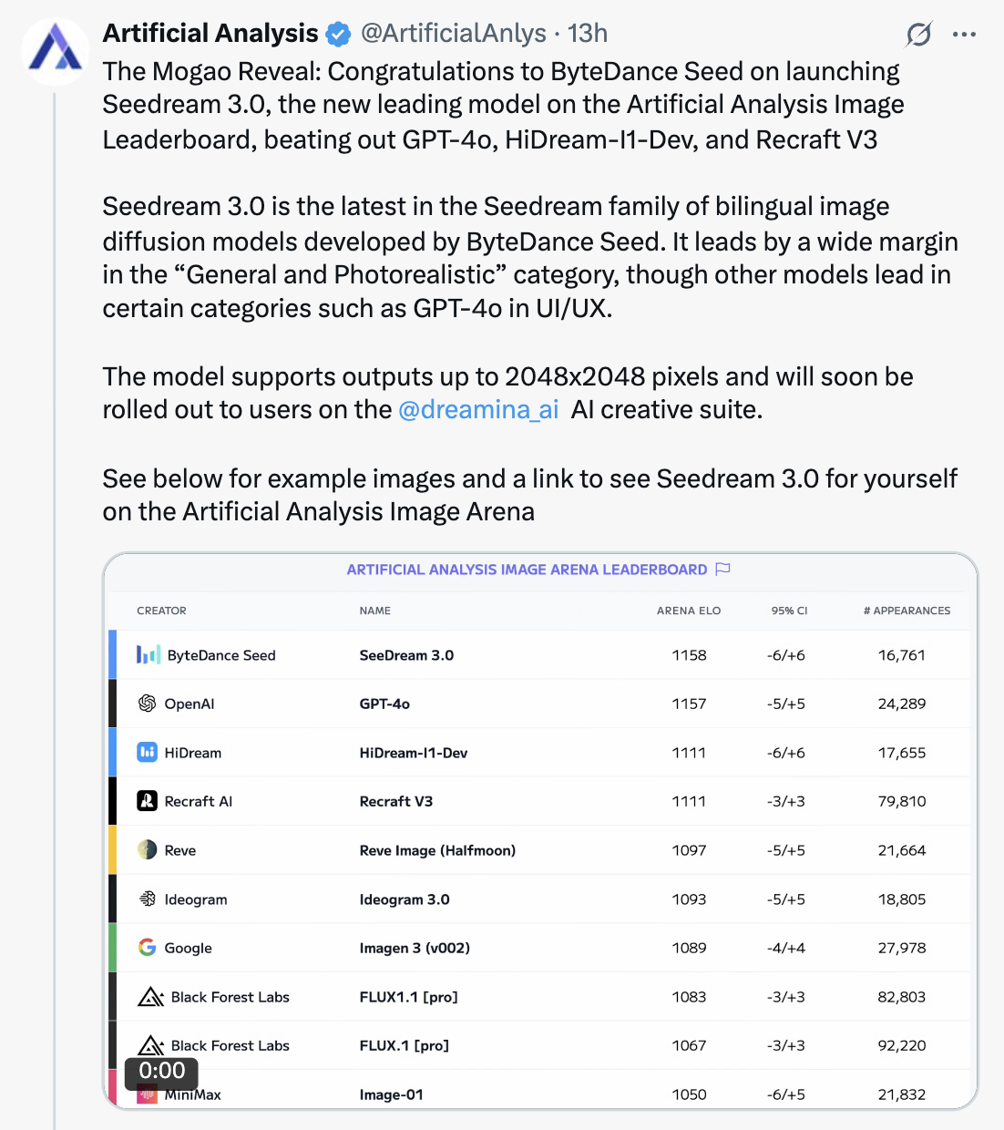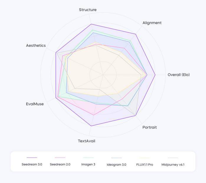 文生图领域权威的第三方榜单Artificial Analysis竞技场发布消息称,字节跳动Seed团队图像生成模型Seedream 3.0综合性能已追平文生图SOTA模型GPT-4o,稳定超越Recraft V3、Ideogram、Imagen 3、Midjourney V6.1等模型,进入全球第一梯队。