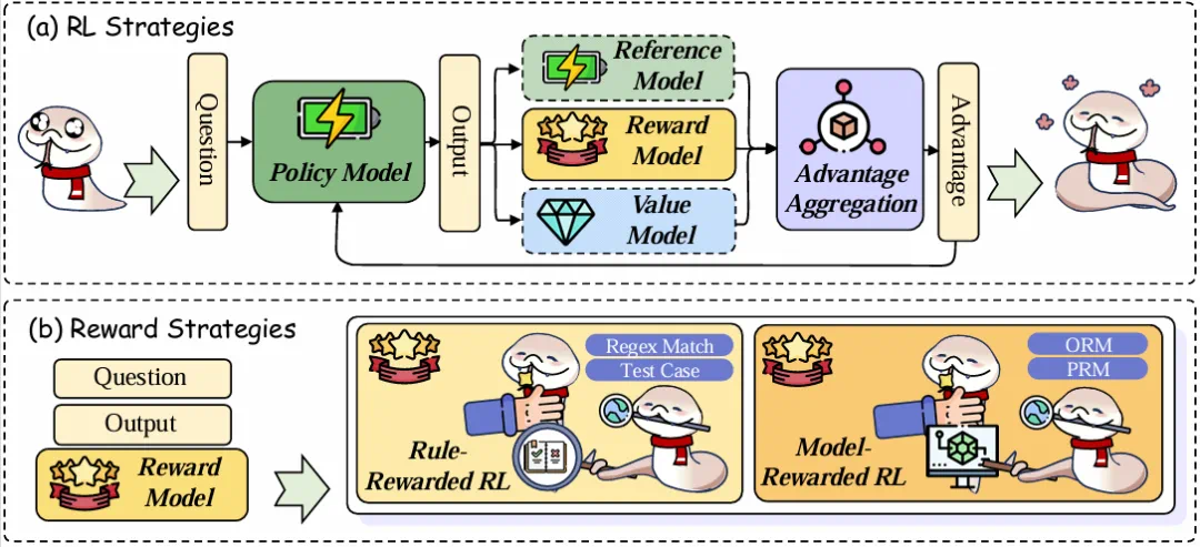 图 9:用于优化内部探索的两类主要方法:(a) 强化学习策略:通过参考模型与价值模型辅助,结合奖励模型进行优势聚合,从而提升策略模型的输出质量,实现策略优化。(b) 奖励策略:根据模型输出设计奖励机制,包括规则驱动奖励,例如使用正则匹配或测试用例打分;以及模型驱动奖励,基于如和 PRM 等评价模型生成奖励,以提升强化学习性能。