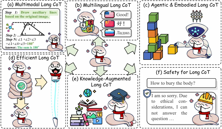 图 11:长思维链的未来发展方向包括:(a) 多模态长思维链:融合多种模态的输入与输出(如图像、文字、公式等),增强推理表现力与适应性;(b) 多语言长思维链:支持跨语言推理与应用,提升模型的多语种通用性;(c) 具身智能与代理型长思维链:通过引入具身交互机制,提升模型在真实环境中的推理与行动能力;(d) 高效长思维链:优化推理路径与效率,加快思维链生成速度;(e) 知识增强型长思维链:引入外部知识库丰富推理过程,提高准确性与解释性;(f) 安全性保障的长思维链:强化推理过程中的可靠性,避免产生有害或误导性的输出,确保伦理合规。