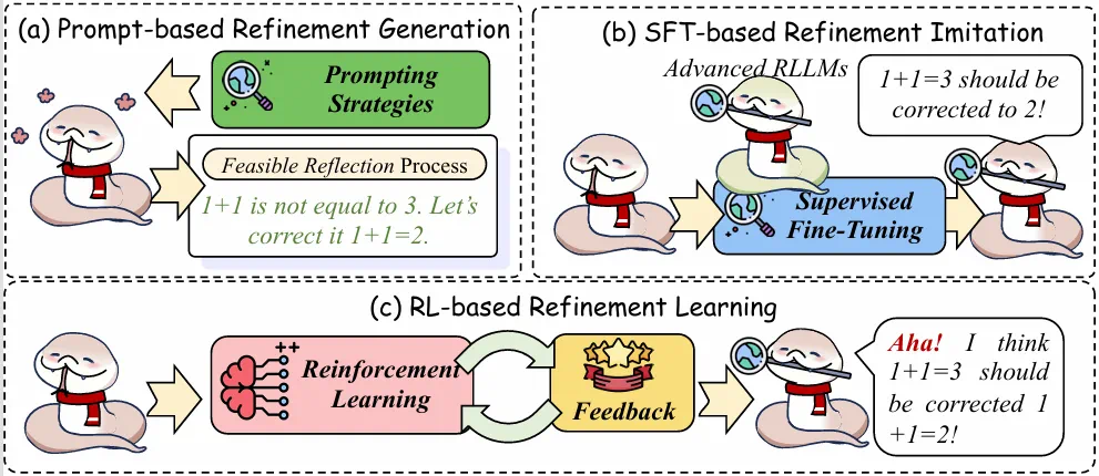 图 7:细化方法主要分为三类:(a) 基于提示的改进生成,通过构造合适的提示策略,引导模型进行可行的反思过程并产出修正答案;(b) 基于监督微调的改进模仿,利用来自高级推理大模型的细化示例,通过监督学习对模型进行微调;(c) 基于强化学习的改进学习,模型根据反馈信号(如奖励)对自身生成的修正进行优化,逐步学会自我改进推理与输出。