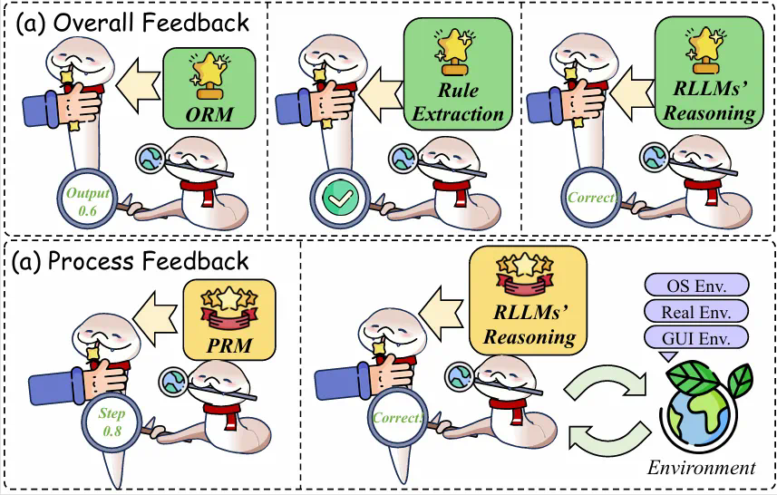 图 6:可行反思的反馈能力框架包括总体反馈与过程反馈两种形式。总体反馈包括:结果奖励模型(以数值形式进行反馈、基于规则的正确性判断机制,以及基于推理大模型的总体评价模型。过程反馈则包含:以数值形式提供反馈的过程奖励模型,以及基于推理大模型的逐步评价模型。此外,过程反馈还可结合操作系统环境、真实环境或图形界面环境等进行交互式评估。