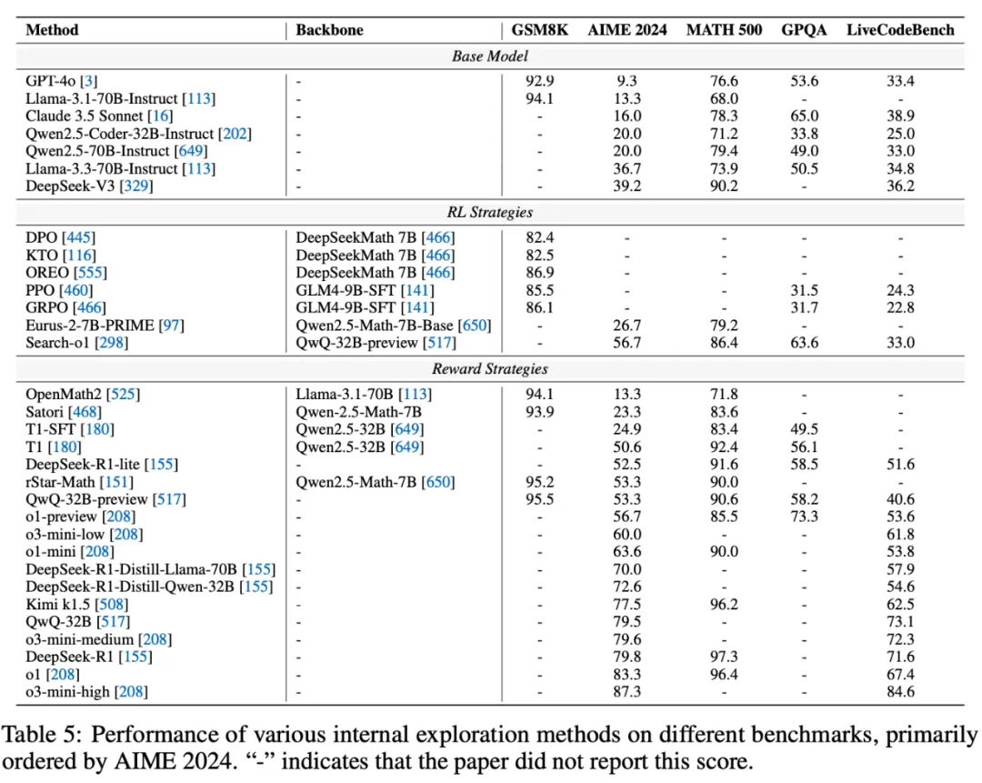 表 5:不同内部探索方法在多个基准测试上的性能表现,主要按 AIME 2024 排序。“-” 表示论文未报告该得分。