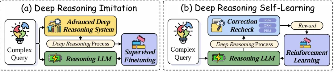 图 5:深度推理学习的不同策略,包括:(a) 深度推理模仿学习,即模仿来自高级深度推理系统(如高级推理大模型、MCTS 等)产生的数据,通过监督微调训练推理模型;(b) 深度推理自我学习,即通过隐式奖励驱动的基于偏好的强化学习,实现推理模型的自我改进与优化。