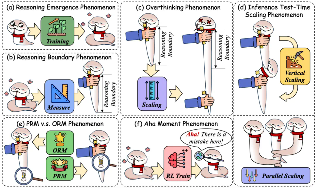 图 3:对长思维链外部行为六个经典现象的分析:(a)当前推理大模型为何会产生长思维链;(b)当前长思维链系统的推理边界及其局限性;(c)当超出推理大模型的推理边界时,过度思考可能导致的性能衰退;(d)测试阶段扩展方法的应用及其扩展规律与局限性;(e)使用过程中的奖励模型与结果奖励模型效果对比;(f)“顿悟” 时刻的探索及其潜在原因。