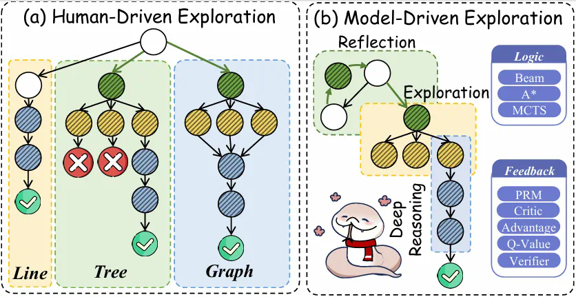 图 11:外部探索策略根据过程管理角色的不同可分为两类:(a) 人类驱动的探索:由人工设定的提示词与固定流程控制推理过程,探索结构通常为线性、树状或图状,但路径固定、缺乏适应性。(b) 模型驱动的探索:由模型主导进行探索,具备反思与自适应搜索能力,采用动态结构并结合 Beam、A*、MCTS 等搜索逻辑与多种反馈机制(如 PRM、Critic、Advantage、Q-Value、Verifier)来实现更灵活且高效的深度推理。