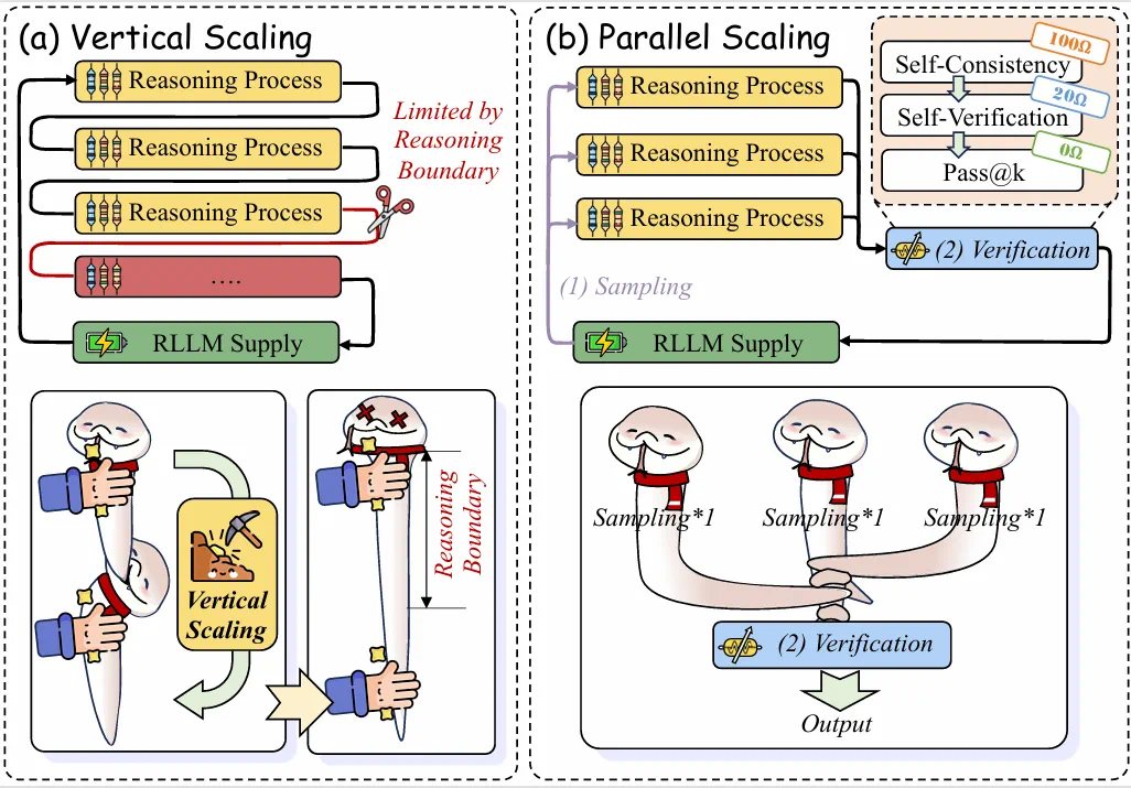 图 8:推理测试阶段的两种常见扩展策略示意图,包括:(a) 纵向扩展:通过延长模型的长链式思维过程以增强推理能力,但受限于大语言模型的推理边界,最终可能难以突破性能瓶颈。(b) 横向扩展:通过增加采样次数生成多个推理结果,并结合自一致性、自验证等机制进行结果验证与整合,从而提升输出的整体质量,但其性能上限仍不超过 Pass@k 指标所代表的理论最优水平。