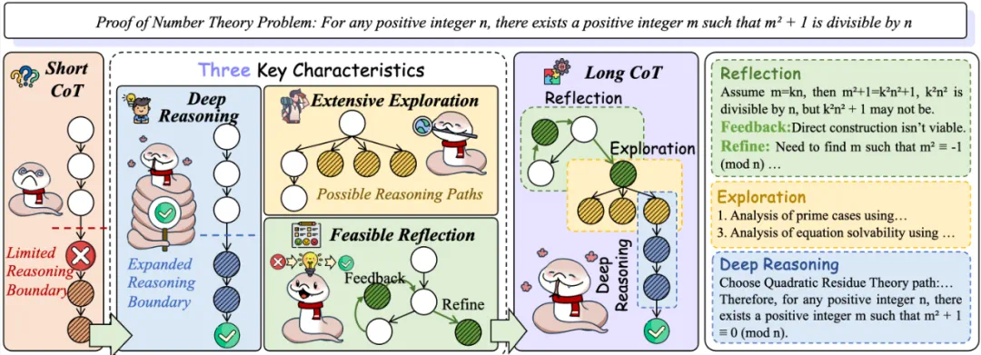 随后,该论文深入拆解 长思维链的三大关键特性,即深度推理、广泛探索和可行性反思,揭示其如何在提升推理能力的同时,也带来了计算开销、冗余推理等挑战。