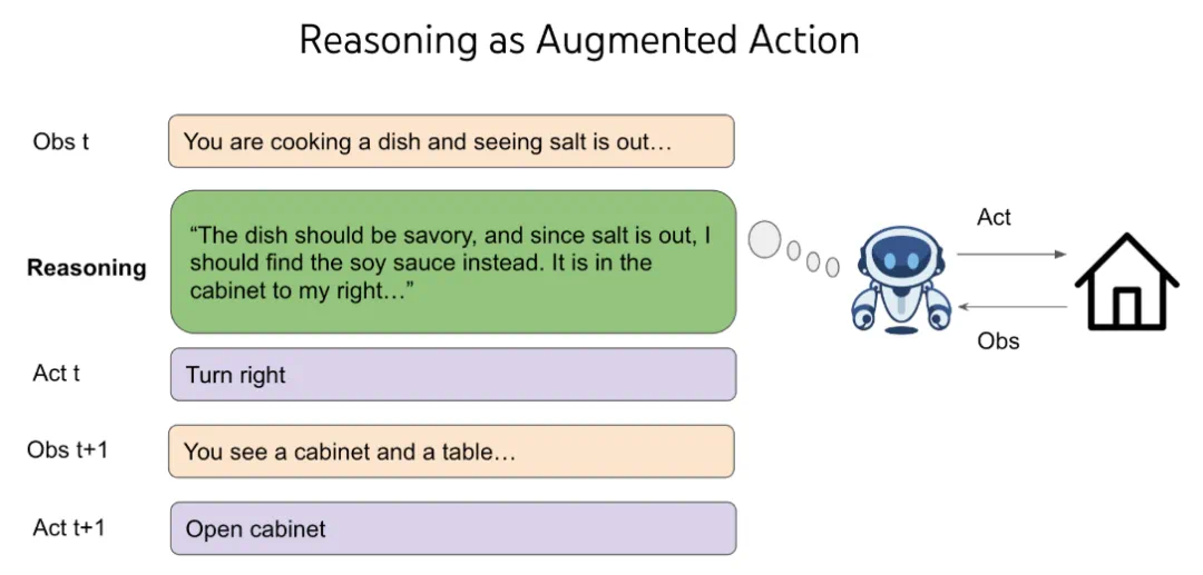 思考或推理是一种独特的行动,它不直接改变外部世界,但其空间是开放和无限的。在经典强化学习中,这样的无界组合会使决策复杂化。例如,如果从两个盒子中选择一个,其中一个有 100 万美元,另一个为空,你的期望收益是 50 万美元。若增加无限多的空盒子,期望收益变为零。然而,通过将推理引入强化学习环境的动作空间,我们能利用语言预训练的先验知识,实现泛化,并在决策时进行灵活的计算。读者可以通过阅读 ReAct 以了解智能体推理的初始故事。