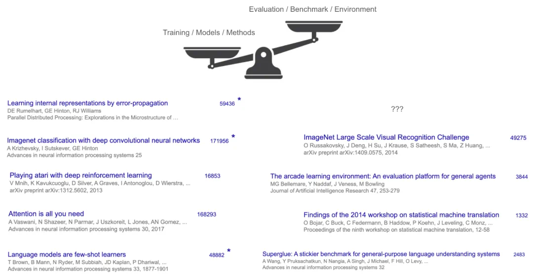 理解上半场的关键在于其赢家。影响力最大的 AI 论文如 Transformer、AlexNet 和 GPT-3 等,都是提出基础性突破的训练方法,而非基准测试。尽管 ImageNet 是一个重要的基准测试,但其引用量仍远低于 AlexNet。这表明,方法与基准测试之间的关系在其他领域更为显著。