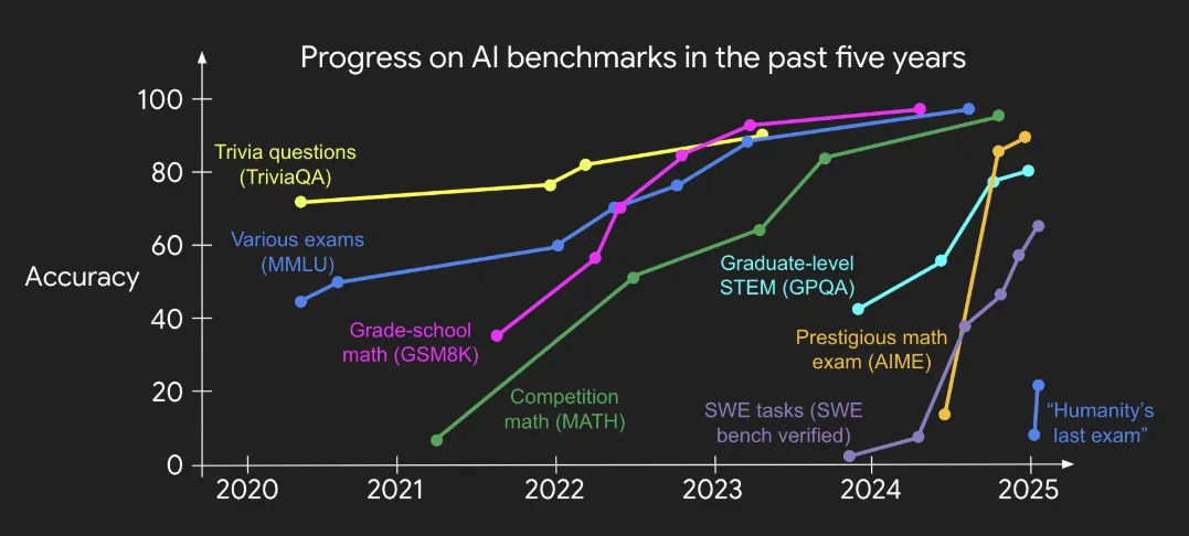 即使我们创建更困难的基准,很快(而且越来越快)它们也会被这个配方解决。我的同事 Jason Wei 制作了一个漂亮的图来很好地可视化这个趋势: