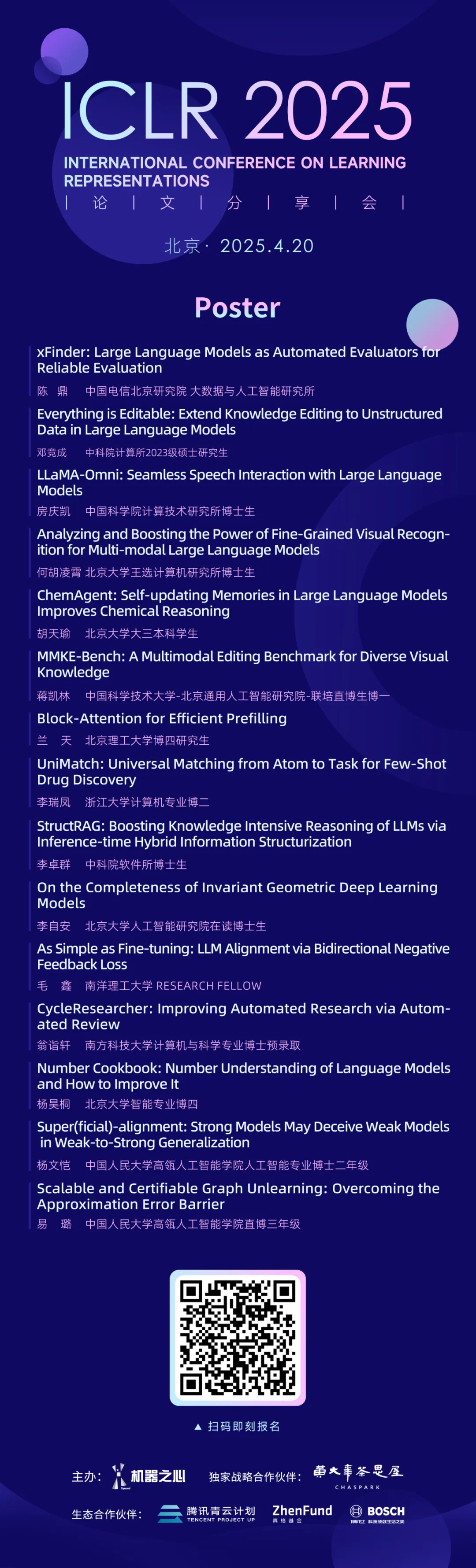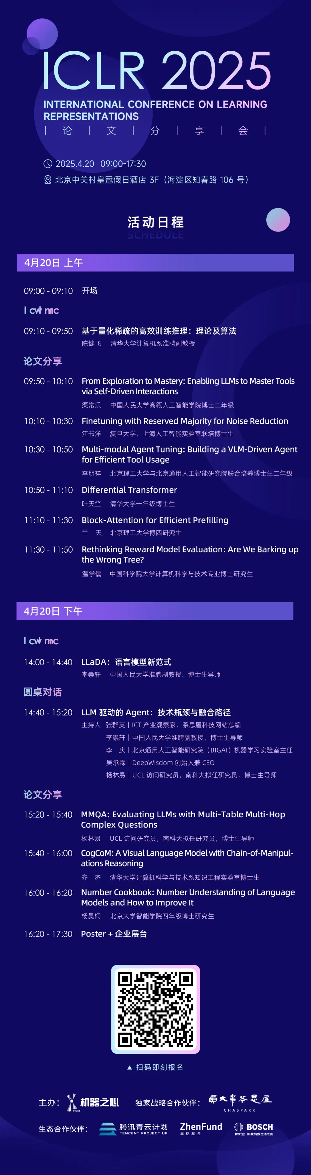 为让从业者全面了解 AI 社区涌现的最新创新成果和发展趋势,机器之心计划 4 月 20 日在北京举办「ICLR 2025 论文分享会」,围绕着训练推理、多模态、Agent 等热门主题邀请顶级专家、论文作者与现场参会观众共同交流。