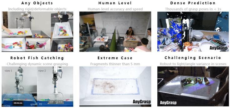 这是机器人首次在任意场景抓取任意物体时,表现出堪比人类的能力,既无需物体 CAD 模型和检测,对硬件构型、相机也无限制。 因此,AnyGrasp 被很多研究者当作抓取的通用模型使用。