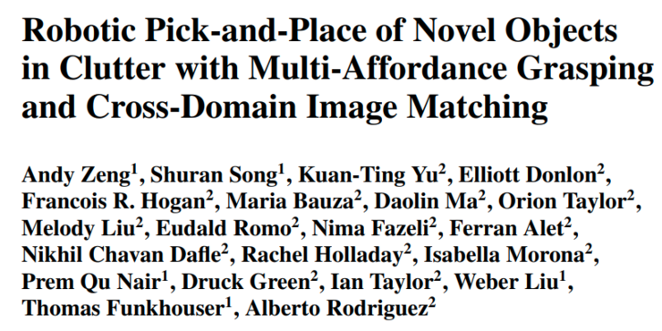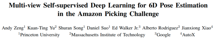 最终 MIT-普林斯顿队获得 Stowing Task(装载任务)第三名、挑拣任务的第四名,并提出一种基于多视角 RGB-D 数据的自监督深度学习方法,通过全卷积神经网络分割场景并匹配 3D 模型,无需手动标注即可生成训练数据,实现复杂场景下 6D 物体姿态的可靠估计。