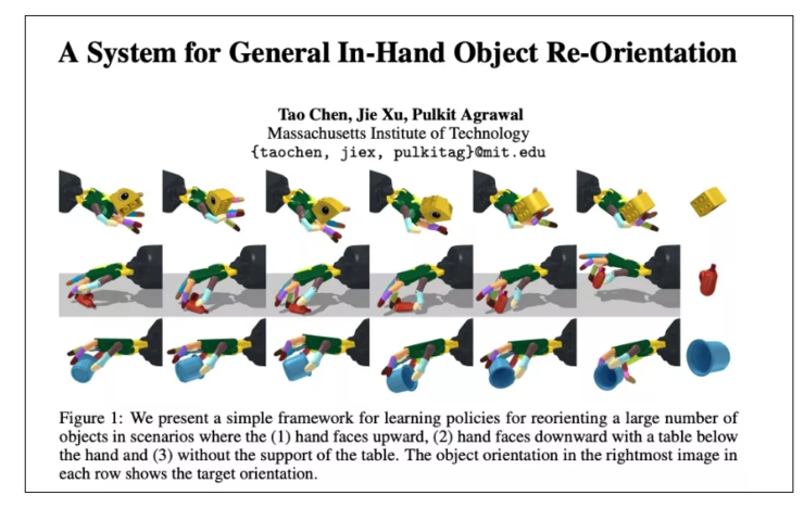 起初实验室没有灵巧手,陈涛便在仿真器上开始探索,用强化学习和模仿学习训练灵巧手控制器,并且展示了灵巧手在手面朝下此最极端的情况下也能转动任意形状的物体,而且还通过无模型框架重新定位了超 2000 个形状各异的物体,具有非常高的通用性。
