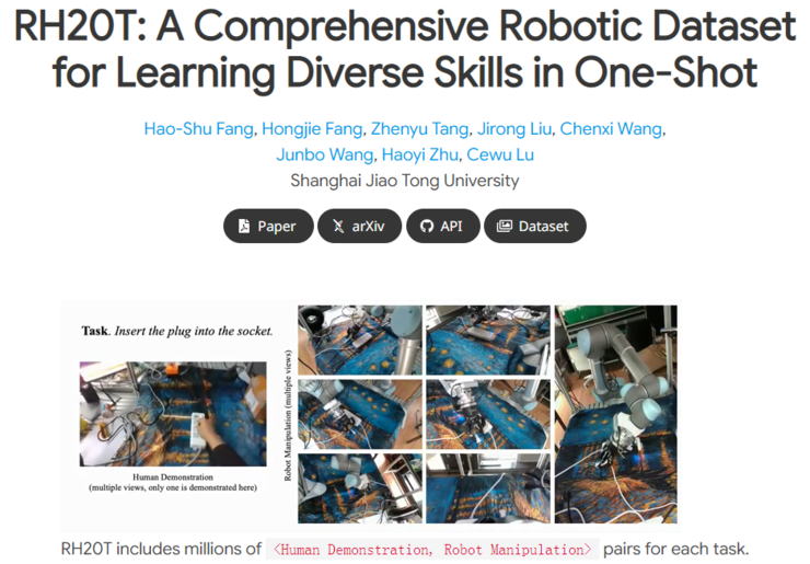 但当时更关键的是缺少合适的数据集,为此方浩树和团队花数年采集 RH20T 数据集,包含了超过 11 万机器人操作序列,提供了视觉、力、音频、运动轨迹、演示视频和自然语言指令等多种数据模态,发布后不久便收到了谷歌的邀请,成为大中华区最早参与 Open X-Embodiment 数据集的一支队伍。