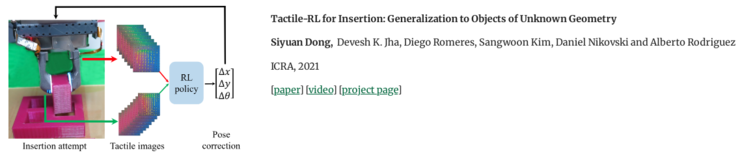 受深度学习浪潮影响,董思远开始探索其在机器人操作中的应用。但因两位导师都并非深度学习领域,尤其 Alberto 倾向基于模型的方法,所以在 MIT 的最后一年,董思远自行钻研机器人学习在插拔任务中的应用,开发了基于强化学习的高维触觉控制框架。