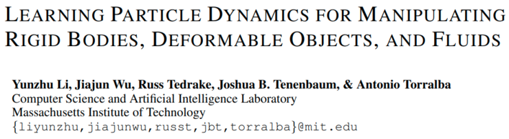 博一下学期,李昀烛与吴佳俊合作提出了动态粒子交互网络(DPI-Nets),以粒子作为环境表征,统一建模刚体、流体与可变形物体,并通过图神经网络学习粒子间的动力学关系。该研究发表于 ICLR 2019,为解决物理模拟与现实之间的偏差问题提供了新思路。DPI-Nets 能够将传感器数据转换为粒子表示,从而实现多种物体动力学的高效模拟与控制,支撑机器人在复杂环境中操控不同材质物体,完成多样化的操作任务。