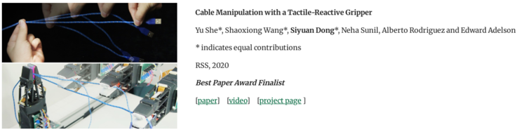 到了博四,董思远与 Ted 团队合作自己最具代表性的成果——触觉反馈夹爪的线缆操作研究,并获得机器人顶会 RSS 2020 最佳论文提名奖。
